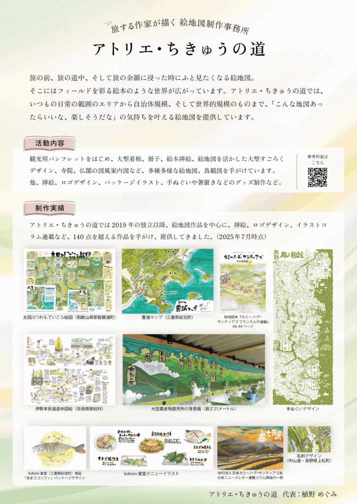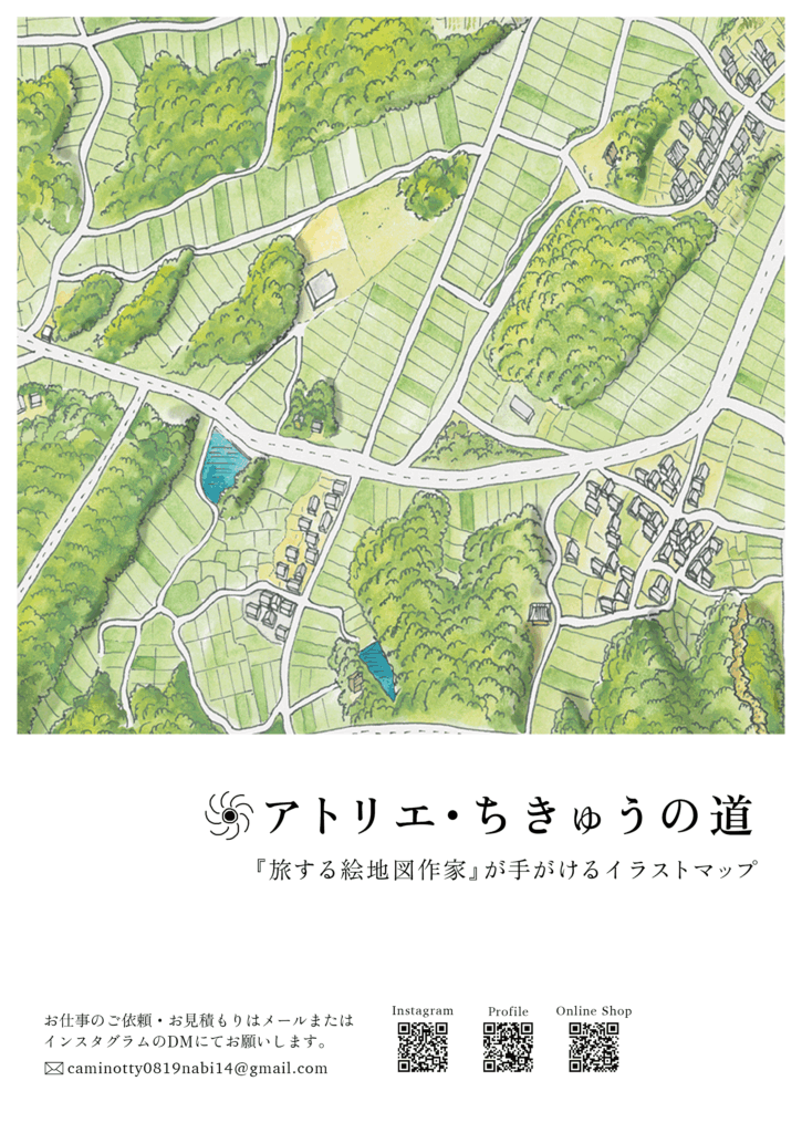 ・「絵地図」という表現や自身のタッチ(方角や地理的特徴に旅人目線でこだわっている点など)を伝えること。実物がないとピンとこない方も多いため、そういった場面でこのチラシを活用してもらいたいと考えました。